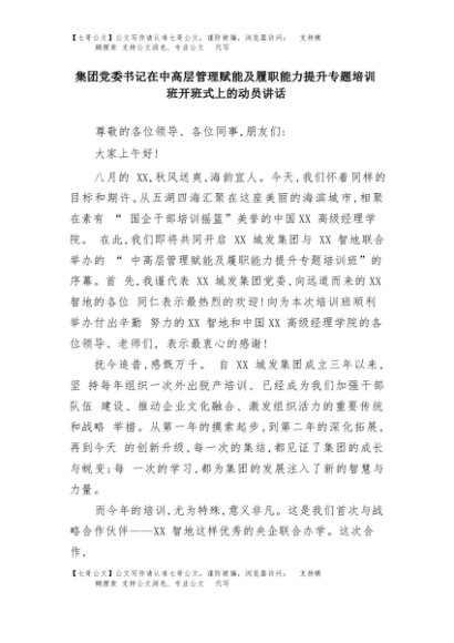 【七哥公文】2025年:集团党委书记在中高层管理赋能及履职能力提升专题培训班开班式上的动员讲话+更多免费公文+VX:QiGeGongWen2024