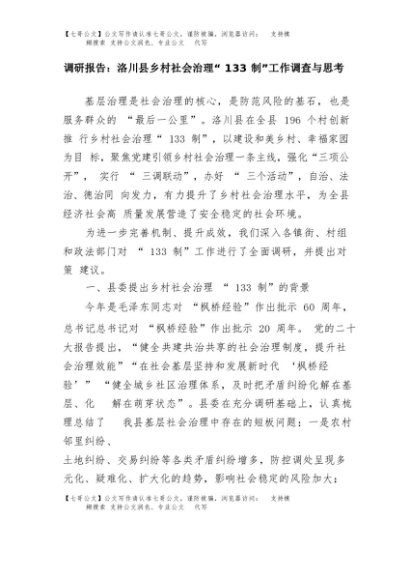 【七哥公文】2025年:调研报告:洛川县乡村社会治理“133制”工作调查与思考+更多免费公文+VX:QiGeGongWen2024
