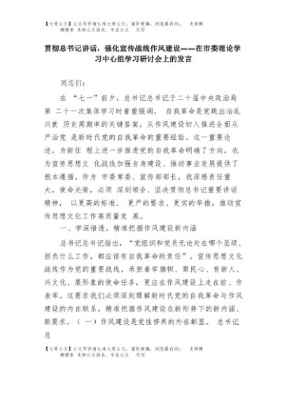 【七哥公文】2025年:贯彻总书记讲话,强化宣传战线作风建设——在市委理论学习中心组学习研讨会上的发言+更多免费公文+VX:QiGeGongWen2024