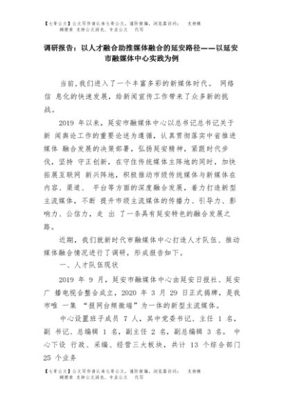 【七哥公文】2025年:调研报告:以人才融合助推媒体融合的延安路径——以延安市融媒体中心实践为例+更多免费公文+VX:QiGeGongWen2024