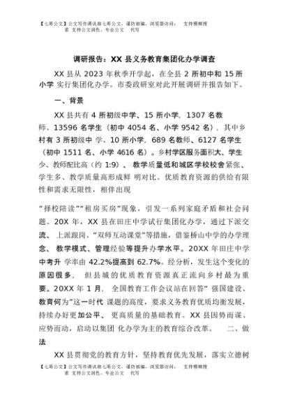 【七哥公文】2025年:调研报告:XX县义务教育集团化办学调查+更多免费公文+VX:QiGeGongWen2024