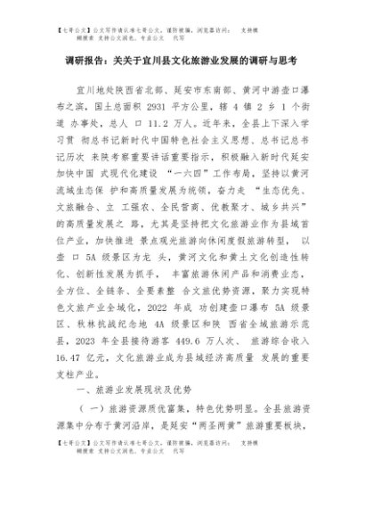 【七哥公文】2025年:调研报告:关关于宜川县文化旅游业发展的调研与思考+更多免费公文+VX:QiGeGongWen2024