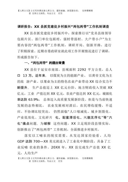 【七哥公文】2025年:调研报告:XX县抓党建促乡村振兴“两包两带”工作机制调查+更多免费公文+VX:QiGeGongWen2024