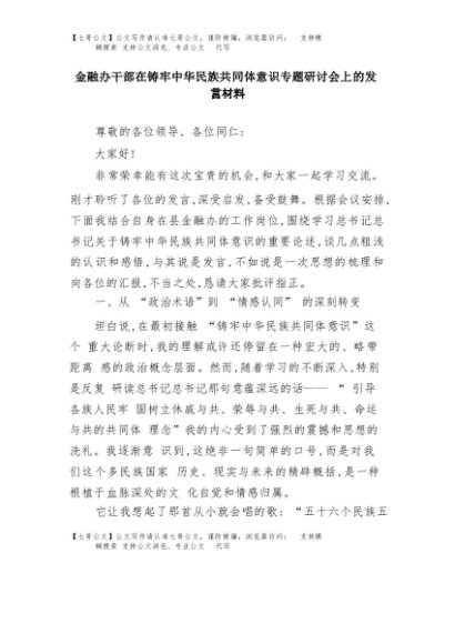 【七哥公文】2025年:金融办干部在铸牢中华民族共同体意识专题研讨会上的发言材料+更多免费公文+VX:QiGeGongWen2024