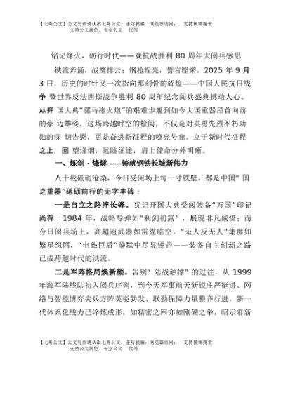 【七哥公文】2025年:铭记烽火,砺行时代——观抗战胜利80周年大阅兵感思+更多免费公文+VX:QiGeGongWen2024