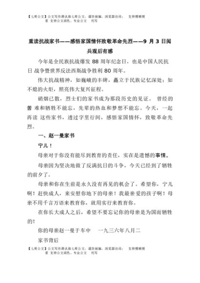 【七哥公文】2025年:重读抗战家书——感悟家国情怀 致敬革命先烈——9月3日阅兵观后有感+更多免费公文+VX:QiGeGongWen2024