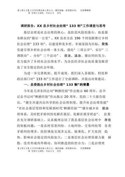 【七哥公文】2025年:调研报告:XX县乡村社会治理“133制”工作调查与思考+更多免费公文+VX:QiGeGongWen2024