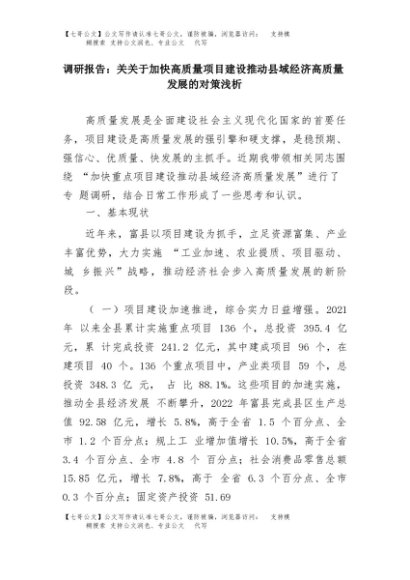 【七哥公文】2025年:调研报告:关关于加快高质量项目建设 推动县域经济高质量发展的对策浅析+更多免费公文+VX:QiGeGongWen2024