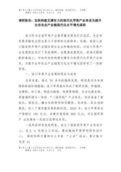 【七哥公文】2025年:调研报告:加快构建支撑有力的现代化苹果产业体系为提升全市农业产业链现代化水平增光添彩+更多免费公文+VX:QiGeGongWen2024