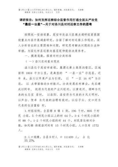 【七哥公文】2025年:调研报告:如何发挥巡察综合监督作用 打通全面从严治党“最后一公里”--关于对洛川县对村巡察工作的思考+更多免费公文+VX:QiGeGongWen2024
