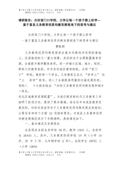 【七哥公文】2025年:调研报告:办好家门口学校,力争让每一个孩子都上好学--基于富县义务教育优质均衡发展视角下的思考与建议+更多免费公文+VX:QiGeGongWen2024