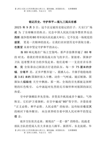 / 【七哥公文】2025年:铭记历史,守护和平—观九三阅兵有感+更多免费公文+VX:QiGeGongWen2024