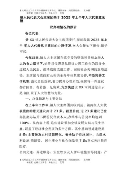 【七哥公文】2025年:镇人民代表大会主席团关于2025年上半年人大代表意见建议办理情况的报告+更多免费公文+VX:QiGeGongWen2024