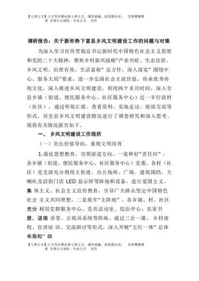 【七哥公文】2025年:调研报告:关于新形势下富县乡风文明建设工作的问题与对策+更多免费公文+VX:QiGeGongWen2024