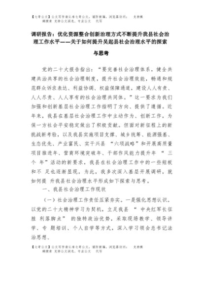 【七哥公文】2025年:调研报告:优化资源整合 创新治理方式 不断提升我县社会治理工作水平——关于如何提升吴起县社会治理水平的探索与思考+更多免费公文+VX:QiGeGongWen2024