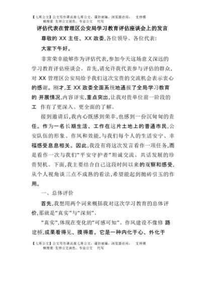 【七哥公文】2025年:评估代表在管理区公安局学习教育评估座谈会上的发言+更多免费公文+VX:QiGeGongWen2024