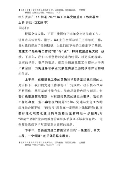 【七哥公文】2025年:组织委员在XX街道2025年下半年党建重点工作部署会上的讲话(2329字)+更多免费公文+VX:QiGeGongWen2024