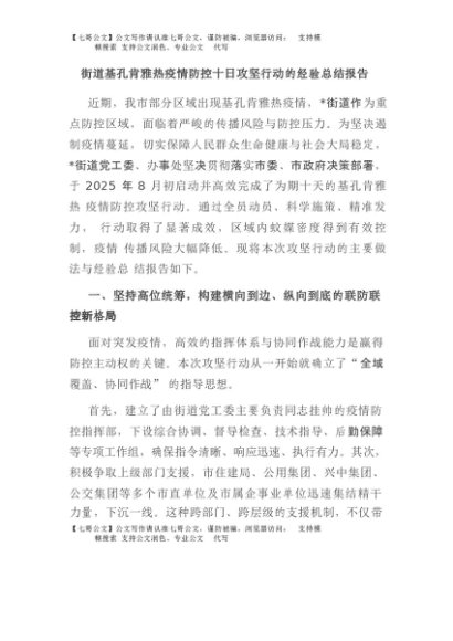 【七哥公文】2025年:街道基孔肯雅热疫情防控十日攻坚行动的经验总结报告+更多免费公文+VX:QiGeGongWen2024