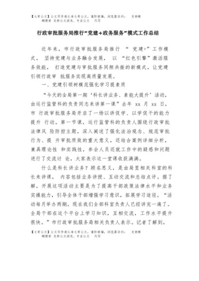 【七哥公文】2025年:行政审批服务局推行“党建+政务服务”模式工作总结+更多免费公文+VX:QiGeGongWen2024