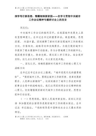 【七哥公文】2025年:深学笃行新思想,精雕细琢新家园——在学习贯彻中央城市工作会议精神专题研讨会上的发言+更多免费公文+VX:QiGeGongWen2024