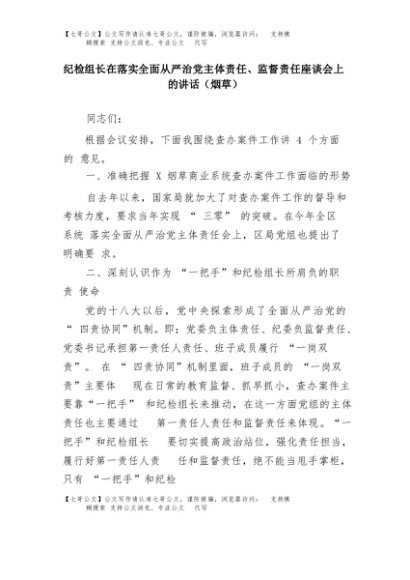 【七哥公文】2025年:纪检组长在落实全面从严治党主体责任、监督责任座谈会上的讲话(烟草)+更多免费公文+VX:QiGeGongWen2024