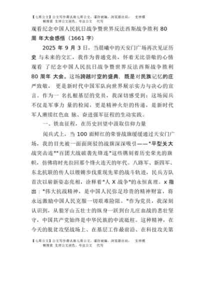 【七哥公文】2025年:观看纪念中国人民抗日战争暨世界反法西斯战争胜利80周年大会感悟(1661字)+更多免费公文+VX:QiGeGongWen2024
