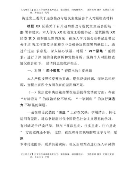 【七哥公文】2025年:街道党工委关于巡察整改专题民主生活会个人对照检查材料+更多免费公文+VX:QiGeGongWen2024