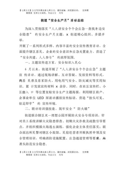 【七哥公文】2025年:街道“安全生产月”活动总结+更多免费公文+VX:QiGeGongWen2024