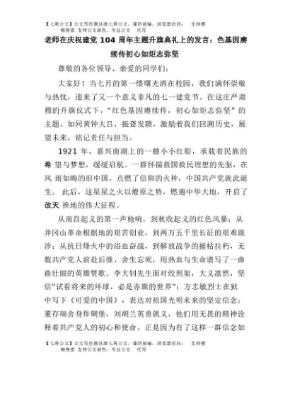 【七哥公文】2025年:老师在庆祝建党104周年主题升旗典礼上的发言:色基因赓续传初心如炬志弥坚+更多免费公文+VX:QiGeGongWen2024