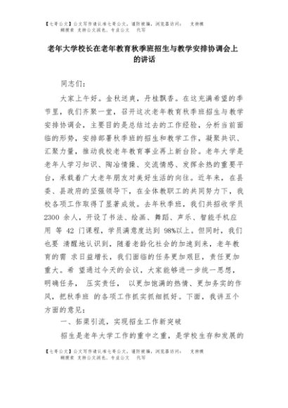 【七哥公文】2025年:老年大学校长在老年教育秋季班招生与教学安排协调会上的讲话+更多免费公文+VX:QiGeGongWen2024
