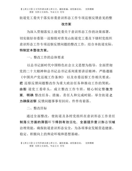 【七哥公文】2025年:街道党工委关于落实市委意识形态工作专项巡察反馈意见的整改方案+更多免费公文+VX:QiGeGongWen2024