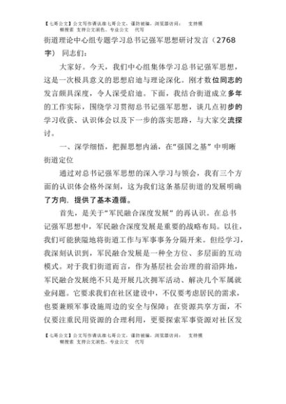 【七哥公文】2025年:街道理论中心组专题学习总书记强军思想研讨发言(2768字)+更多免费公文+VX:QiGeGongWen2024