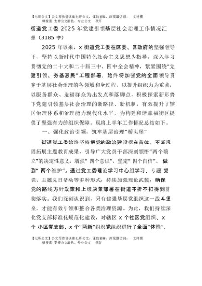 【七哥公文】2025年:街道党工委2025年党建引领基层社会治理工作情况汇报(3185字)+更多免费公文+VX:QiGeGongWen2024