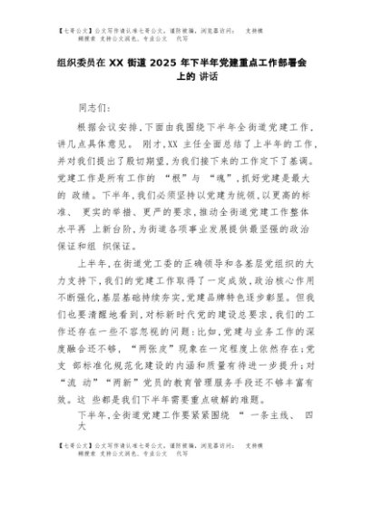 【七哥公文】2025年:组织委员在XX街道2025年下半年党建重点工作部署会上的讲话+更多免费公文+VX:QiGeGongWen2024