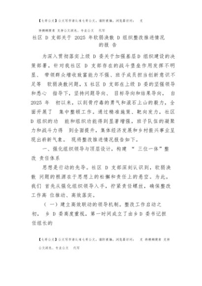 【七哥公文】2025年:社区党支部关于2025年软弱涣散党组织整改推进情况的报告 (1)+更多免费公文+VX:QiGeGongWen2024