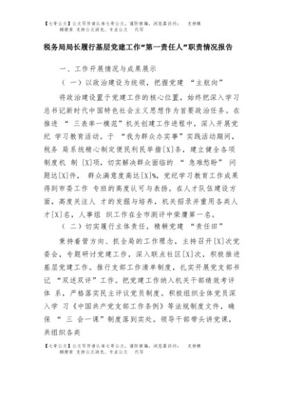 【七哥公文】2025年:税务局局长履行基层党建工作“第一责任人”职责情况报告+更多免费公文+VX:QiGeGongWen2024