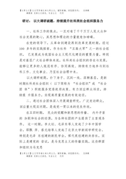 【七哥公文】2025年:研讨:以大调研破题,持续提升社科类社会组织服务力+更多免费公文+VX:QiGeGongWen2024