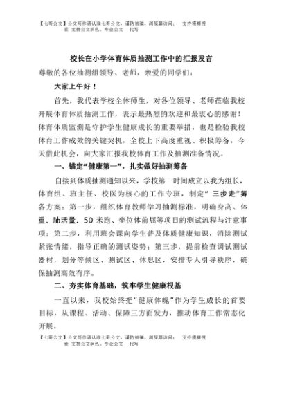 / 【七哥公文】2025年:校长在小学体育体质抽测工作中的汇报发言+更多免费公文+VX:QiGeGongWen2024