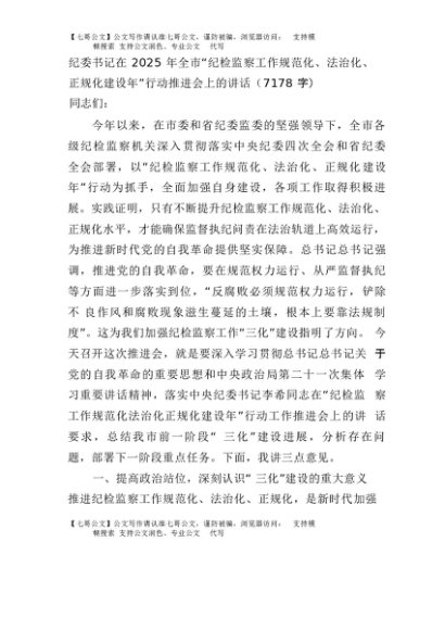 【七哥公文】2025年:纪委书记在2025年全市“纪检监察工作规范化、法治化、正规化建设年”行动推进会上的讲话(7178字)+更多免费公文+VX:QiGeGongWen2024