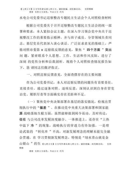 【七哥公文】2025年:水电公司党委书记巡察整改专题民主生活会个人对照检查材料+更多免费公文+VX:QiGeGongWen2024