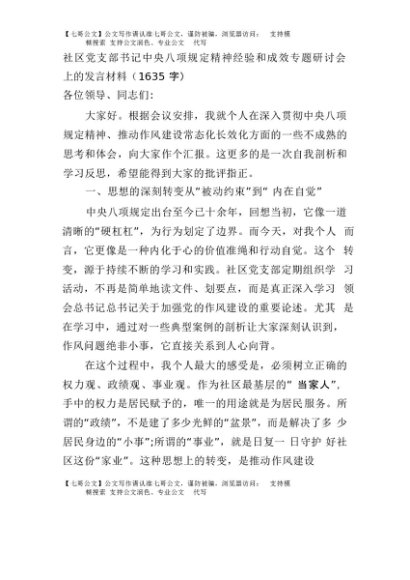 【七哥公文】2025年:社区党支部书记中央八项规定精神经验和成效专题研讨会上的发言材料(1635字)+更多免费公文+VX:QiGeGongWen2024