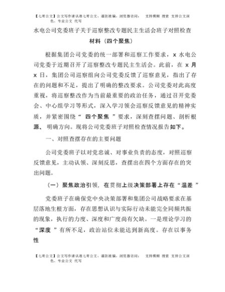 【七哥公文】2025年:水电公司党委班子关于巡察整改专题民主生活会班子对照检查材料(四个聚焦)+更多免费公文+VX:QiGeGongWen2024
