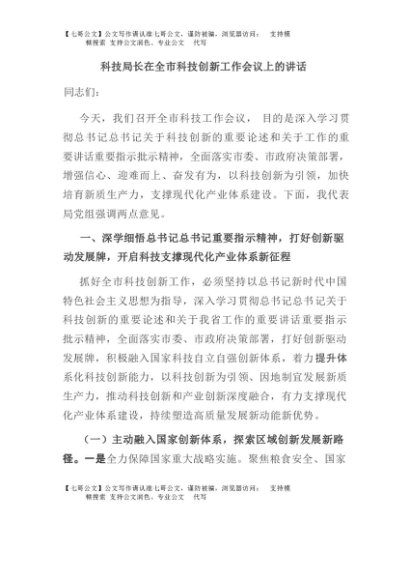 / 【七哥公文】2025年:科技局长在全市科技创新工作会议上的讲话+更多免费公文+VX:QiGeGongWen2024