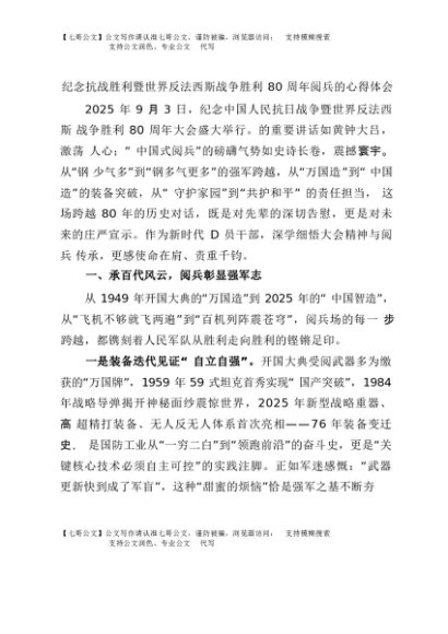【七哥公文】2025年:纪念抗战胜利暨世界反法西斯战争胜利80周年阅兵的心得体会+更多免费公文+VX:QiGeGongWen2024