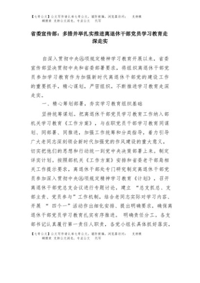 【七哥公文】2025年:省委宣传部:多措并举扎实推进离退休干部党员学习教育走深走实+更多免费公文+VX:QiGeGongWen2024