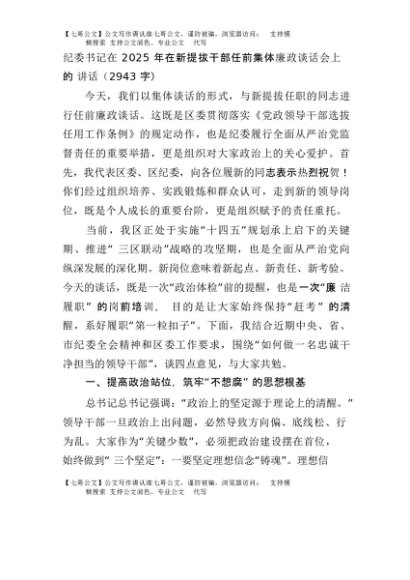 【七哥公文】2025年:纪委书记在2025年在新提拔干部任前集体廉政谈话会上的讲话(2943字)+更多免费公文+VX:QiGeGongWen2024
