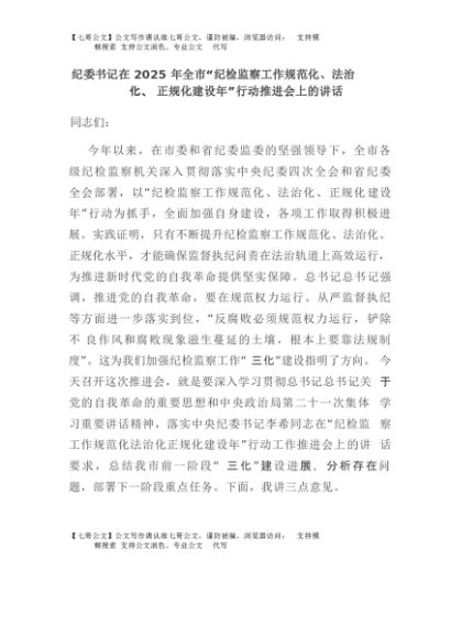 【七哥公文】2025年:纪委书记在2025年全市“纪检监察工作规范化、法治化、正规化建设年”行动推进会上的讲话+更多免费公文+VX:QiGeGongWen2024