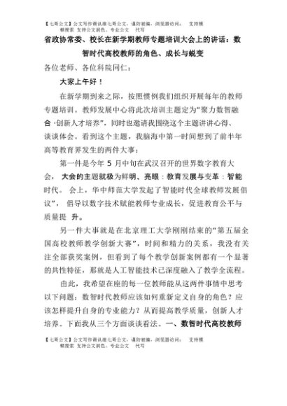 【七哥公文】2025年:省政协常委、校长在新学期教师专题培训大会上的讲话:数智时代高校教师的角色、成长与蜕变+更多免费公文+VX:QiGeGongWen2024