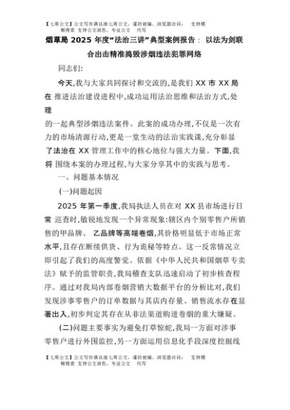 【七哥公文】2025年:烟草局2025年度“法治三讲”典型案例报告:以法为剑联合出击精准捣毁涉烟违法犯罪网络+更多免费公文+VX:QiGeGongWen2024