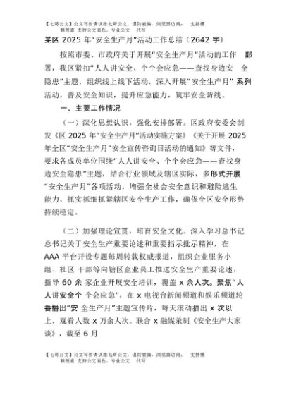 【七哥公文】2025年:某区2025年“安全生产月”活动工作总结(2642字)+更多免费公文+VX:QiGeGongWen2024